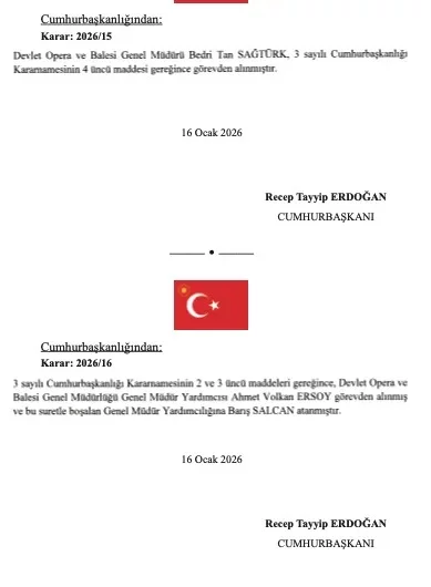 Devlet Opera ve Balesi Genel Müdürü Tan Sağtürk görevden alındı. Sağtürk ile birlikte Genel Müdür Yardımcısı Ahmet Volkan Ersoy da görevden alındı. Ersoy yerine Barış Salcan atandı.