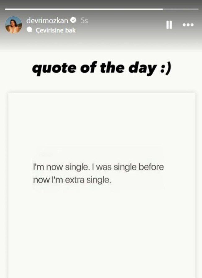 Çıkan aşk iddialarına sessiz kalmayan Devrim Özkan, sosyal medya hesabından bir paylaşım yaparak bu konudaki suskunluğunu bozdu. "Günün alıntısı" notuyla paylaştığı gönderisinde, "Bekarım. Daha önce bekardım, şimdi ekstra bekarım" ifadelerine yer verdi. Özkan'ın bu paylaşımı, aşk iddialarını yalanladığı şeklinde yorumlandı.