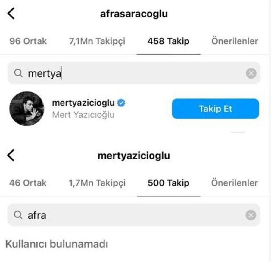 Önceki akşam sevgilisi Dilan Çiçek Deniz ile bir mekan çıkışı görüntülenen ve mutluluğu gözlerden kaçmayan Mert Yazıcıoğlu, 4 yıl aşk yaşadığı Afra Saraçoğlu'nu Instagram'da takipten çıkardı. Saraçoğlu ise Mert Yazıcıoğlu'nu takip etmeyi sürdürüyor.