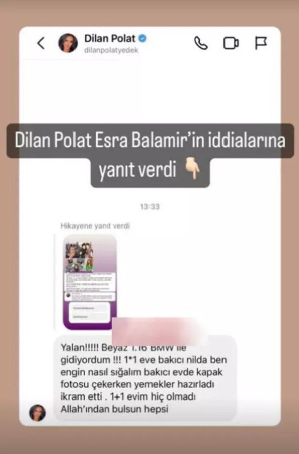 Dilan Polat ise günler sonra sessizliğini bozarak isyan etti. Dilan Polat "Evine de gittim. 1+1 apartman dairesinde oturuyordu. Sonradan zenginliğini görünce inanamadım" diyen Esra Balamir'e şu sözlerle tepki gösterdi:
