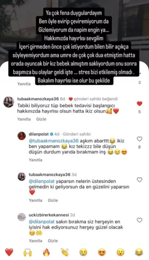 Bir takipçisinin "Tabii ki biliyoruz tüp bebek tedavisi başlangıcı, hakkınızda hayırlı olsun, hatta ikiz olsun!" yorumuna cevap veren Dilan Polat, tüp bebek tedavisine başladıklarını doğruladı.