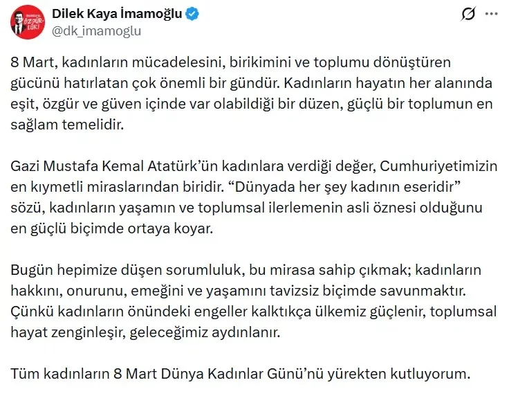 CHP'nin tutuklu cumhurbaşkanı adayı ve İBB Başkanı Ekrem İmamoğlu'nun eşi Dilek Kaya İmamoğlu, 8 Mart Dünya Emekçi Kadınlar Günü dolayısıyla sosyal meyda hesabından paylaşım yaptı.