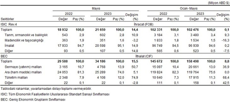 TÜİK, mayıs ayı dış ticaret istatistiklerini duyurdu. Verilere göre mayısta ihracat bir önceki yılın aynı ayına göre yüzde 14,4 artarak 21 milyar 659 milyon dolar, ithalat yüzde 15,5 artarak 34 milyar 186 milyon dolar olarak gerçekleşti.