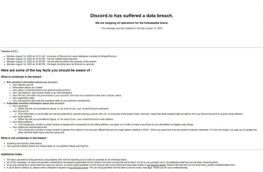 Discord.io sitesi şu anda "Discord.io bir veri ihlali yaşadı. Tüm işlemleri durduruyoruz" şeklinde bir mesaj yayınlayarak siteyi kullanıma kapattığını duyurdu.
