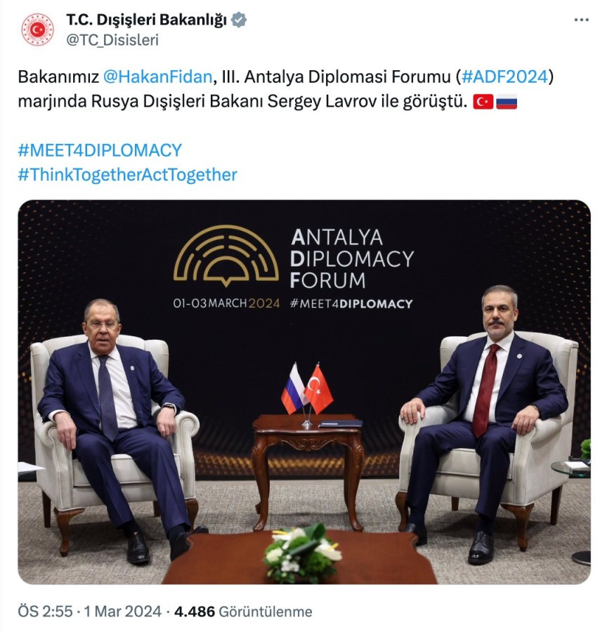 Dışişleri Bakanı Hakan Fidan, 3. Antalya Diplomasi Forumuna katılmak için geldiği Antalya'da, Rusya Dışişleri Bakanı Sergey Lavrov ile görüştü.