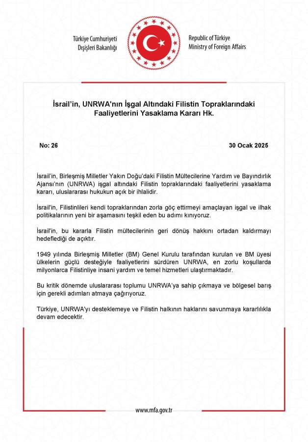 Dışişleri Bakanlığı, "İsrail'in, Birleşmiş Milletler Yakın Doğu'daki Filistin Mültecilerine Yardım ve Bayındırlık Ajansı'nın (UNRWA) işgal altındaki Filistin topraklarındaki faaliyetlerini yasaklama kararı, uluslararası hukukun açık bir ihlalidir. İsrail'in, Filistinlileri kendi topraklarından zorla göç ettirmeyi amaçlayan işgal ve ilhak politikalarının yeni bir aşamasını teşkil eden bu adımı kınıyoruz" açıklamasını yaptı.