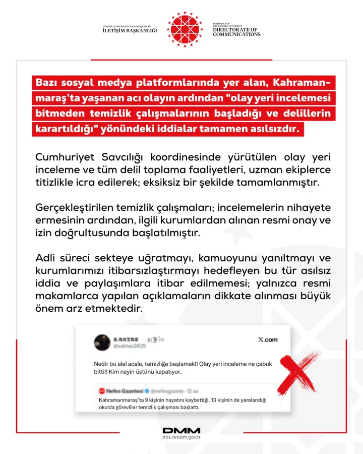 Dezenformasyonla Mücadele Merkezi (DMM), bazı sosyal medya platformlarında yer alan, Kahramanmaraş'ta yaşanan olayın ardından "olay yeri incelemesi bitmeden temizlik çalışmalarının başladığı ve delillerin karartıldığı" yönündeki iddiaların tamamen asılsız olduğunu açıkladı.