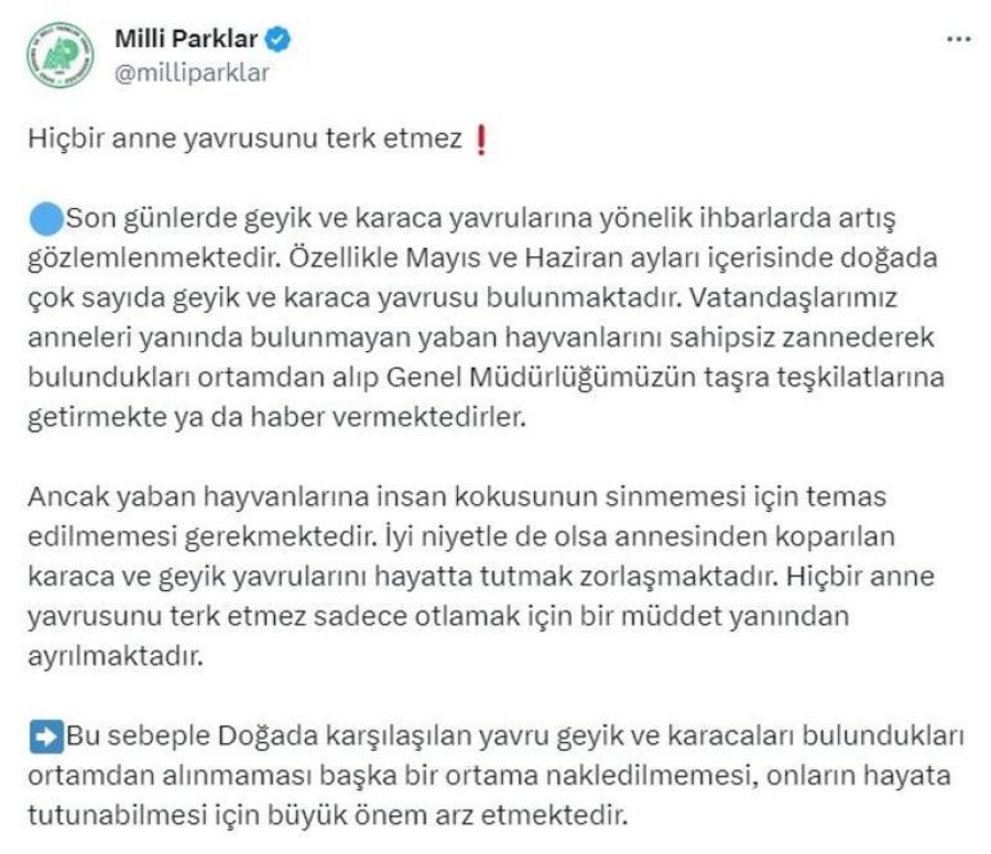 Doğa Koruma ve Milli Parklar (DKMP) Genel Müdürlüğü'nün Twitter hesabından, 'Hiçbir anne yavrusunu terk etmez' notuyla paylaşılan mesajda, son günlerde geyik ve karaca yavrularına yönelik ihbarlarda artış gözlemlendiği belirtilerek, "Özellikle mayıs ve haziran ayları içerisinde doğada çok sayıda geyik ve karaca yavrusu bulunmaktadır. Vatandaşlarımız anneleri yanında bulunmayan yaban hayvanlarını sahipsiz zannederek bulundukları ortamdan alıp genel müdürlüğümüzün taşra teşkilatlarına getirmekte ya da Haber vermektedirler. Ancak yaban hayvanlarına insan kokusunun sinmemesi için temas edilmemesi gerekmektedir" ifadeleri kullanıldı.