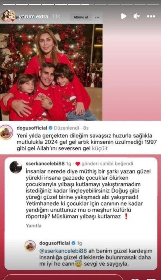Bir süre önce eşinin ailesiyle yaşadığı sorunları aşamayınca İstanbul'a geri döndüğü iddia edilen ve boşanma haberleriyle gündeme gelen Doğuş'un aile pozuna bir takipçi "İnsanlar nerede diye müthiş bir şarkı yazan güzel yürekli insana Gazze'de çocuklar ölürken yılbaşı kutlamayı yakıştıramadım, istediğini kadar linçleyebilirsiniz. Doğuş gibi yüreği güzel birine yakışmadı abi yakışmadı, müslüman yılbaşı kutlamaz" yorumunda bulundu.