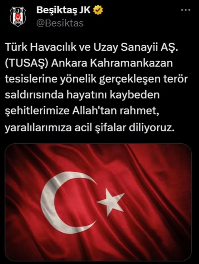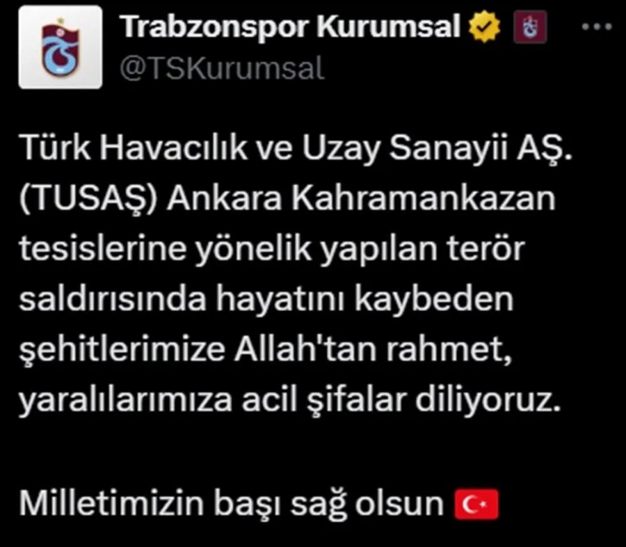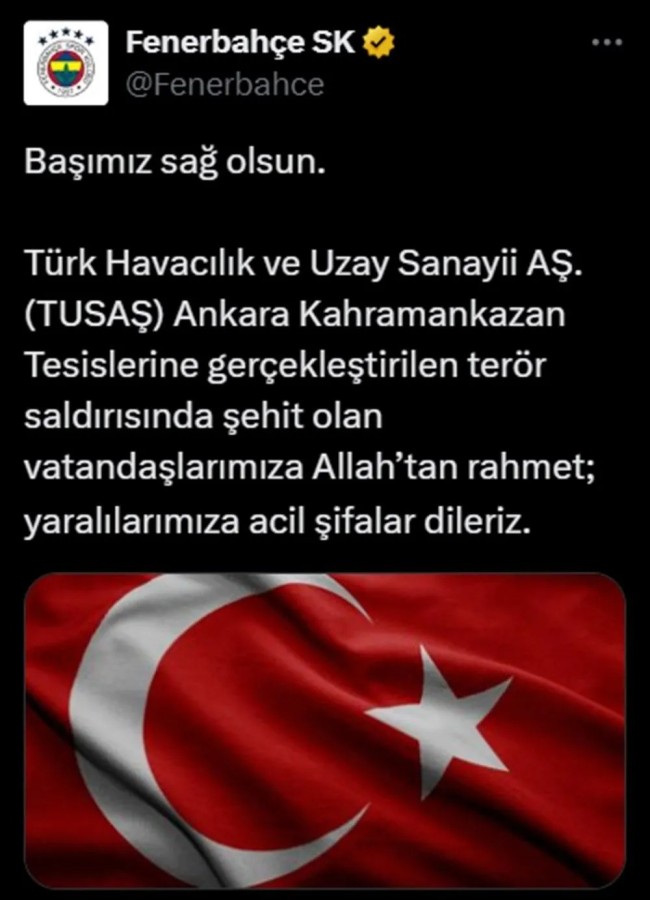 Türk Havacılık ve Uzay Sanayii Anonim Şirketi'nin (TUSAŞ) Ankara'nın Kahramankazan ilçesindeki tesislerine yönelik terör saldırısı gerçekleştirildi. Saldırının ardından Galatasaray, Fenerbahçe, Beşiktaş ve Trabzonspor'dan art arda paylaşımlar yaptı.
