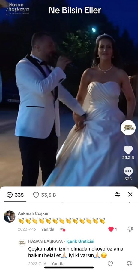 Müzik öğretmeni Hasan Başkaya, görüntülerin kendi hesaplarından değil, çeşitli düğün sayfaları tarafından paylaşıldığını belirterek, "Eşim amatör olarak söyledi. Gelinliğiyle şarkı söylemesi çok dikkat çekti. Kendi hesabımda bin 500 beğeni kaldı ama farklı hesaplar milyonlara ulaştı" dedi.
