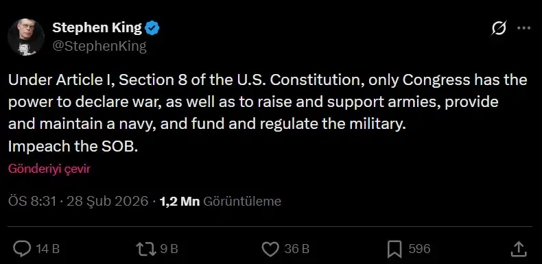 ABD ve İsrail'in İran'a yönelik saldırıları devam ediyor. Ünlü yazar Stephen King sosyal medya hesabından ABD Başkanı Trump'a sert tepki göstererek "O şerefsizi görevden alın" dedi.