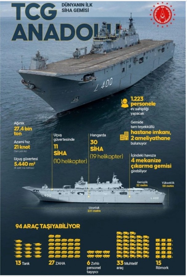 Dünyada bu ölçekte gemiye sahip 12 ülke bulunuyor. TCG Anadolu, üzerine iniş-kalkış yapacak SİHA'larla dünyanın "ilk SİHA gemisi" konumunda. Uçuş güvertesinde 10 helikopter veya 11 SİHA konuşlandırılabilecek, hangarda ise 19 helikopter veya 30 SİHA taşınabilecek.