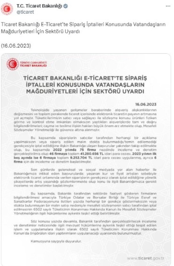 E-ticaret sitelerinin vatandaşların siparişlerini gerekçesiz olarak iptal ettiğine yönelik şikayetlerin artması üzerine Ticaret Bakanlığı harekete geçti. Bakanlıktan yapılan yazılı açıklamada, "ilgili mevzuat hükümlerine aykırılık teşkil ettiği tespit edilen işlem ve uygulamalara ilişkin olarak 6502 sayılı Tüketicinin Korunması Hakkında Kanun'da öngörülen idari yaptırımların uygulanacağı uyarısında bulunulmuştur." ifadelerine yer verildi.