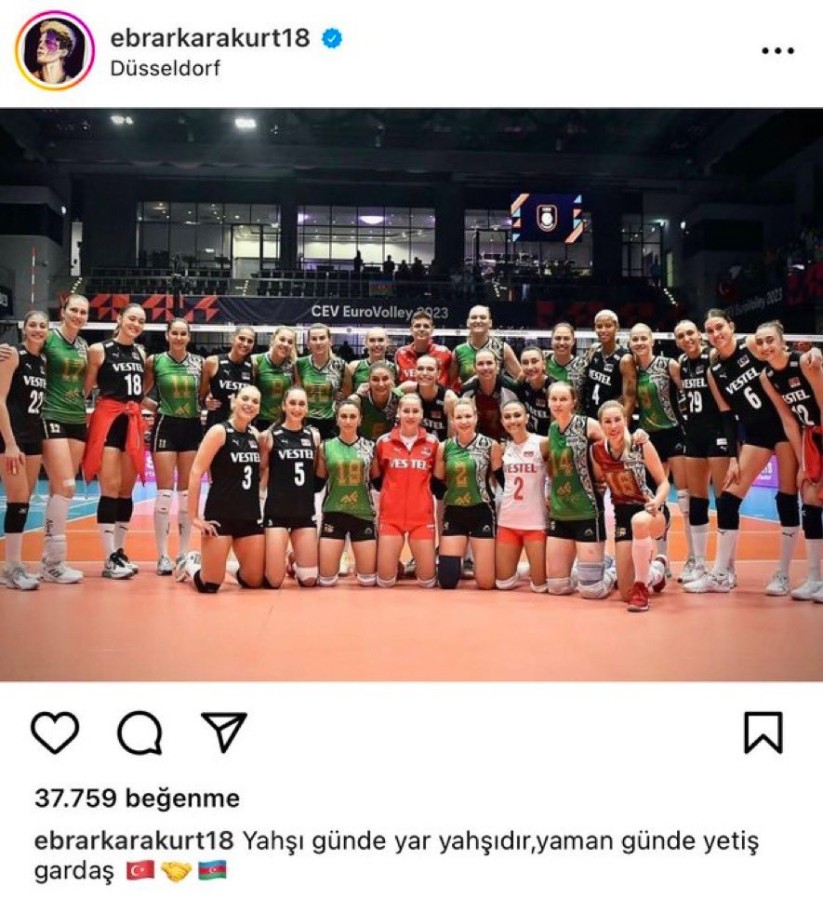 Türkiye Kadın A Milli Voleybol Takımı sporcularından Ebrar Karakurt, Instagram hesabında 3-0 yenilgiye uğrattıkları Azerbaycan voleybol takımı üyeleriyle dostluk pozu paylaştı. Karakurt, paylaştığı fotoğrafın altına Gibi dizisinden bir replik ekleyerek takipçilerini gülümsetti.
