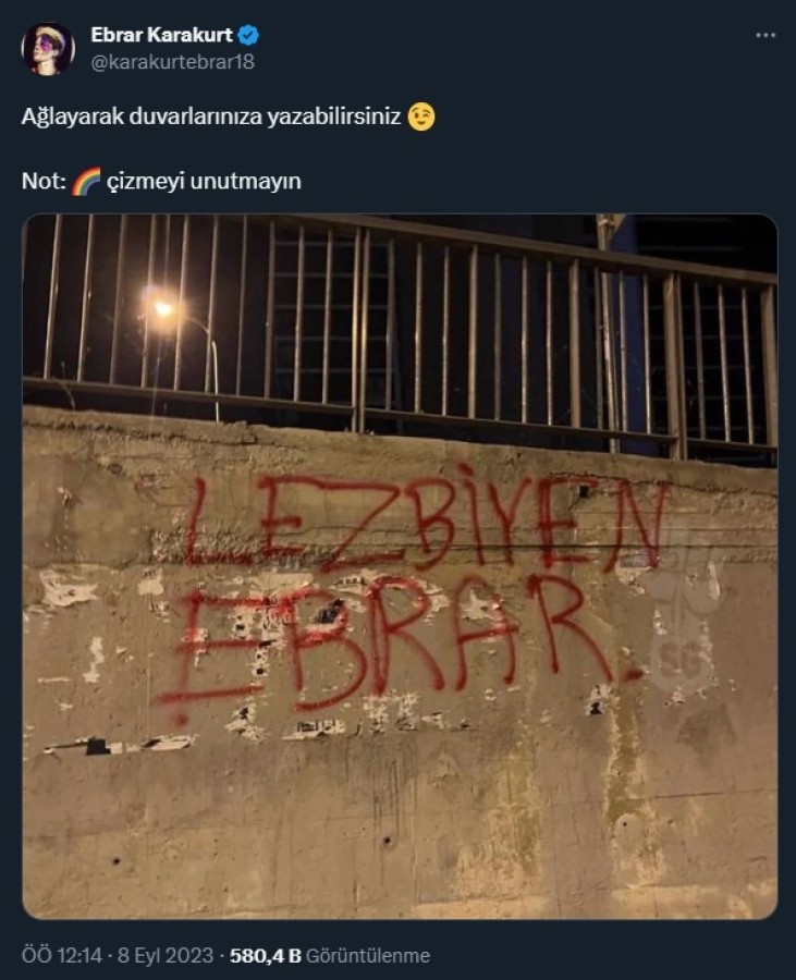 X (Twitter) hesabından "Lezbiyen Ebrar" yazan duvar yazısını paylaşan Karakurt, "Ağlayarak duvarlarınıza yazabilirsiniz" ifadelerini kullandı.