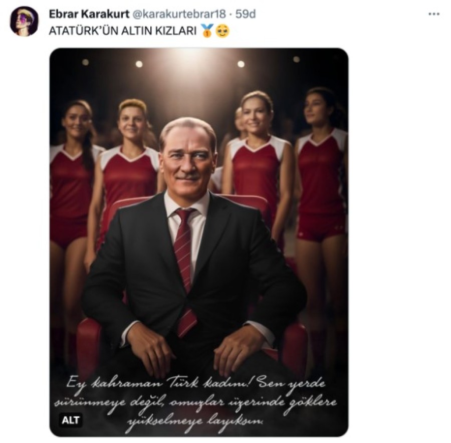 "Ey kahraman Türk kadını! Sen yerde sürünmeye değil, omuzlar üzerinde göklere yükselmeye layıksın" sözünün yer aldığı resimde, Atatürk'ün koltukta oturduğu ve arkasında ise A Milli Kadın Voleybol Takımı'ndan bazı isimlerin yer aldığı görüldü.