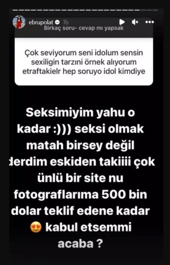 Ebru Polat, bir takipçisine, "Seksi miyim yahu o kadar! Seksi olmak matah bir şey değil derdim eskiden ta ki çok ünlü bir site nü fotoğraflarıma 500 bin dolar teklif edene kadar. Kabul etsem mi acaba?" yanıtını vererek takipçilerini hayrete düşürdü.