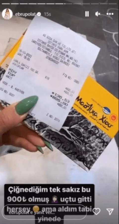 Zaman zaman harcamalarıyla konuşulan şarkıcı Ebru Polat, bir paket sakıza 895 TL ödemiş ve fişi 3,8 milyon takipçisinin bulunduğu Instagram hesabından paylaşmıştı. Ebru Polat, "Çiğnediğim tek sakız bu 900 TL olmuş. Uçtu gitti ama aldım tabii yine de" ifadelerini kullanmıştı.