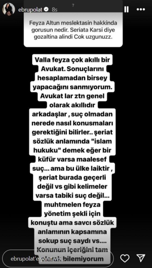 Avukat Feyza Altun sosyal medya paylaşımları nedeniyle gözaltına alındı. Konuyla ilgili birçok isimden yorum gelirken yorum yapanlardan biri de şarkıcı Ebru Polat Oldu. Polat, "Vala Feyza çok akıllı bir avukat. Sonuçlarını hesaplamadan bir şey yapacağını sanmıyorum" dedi.
