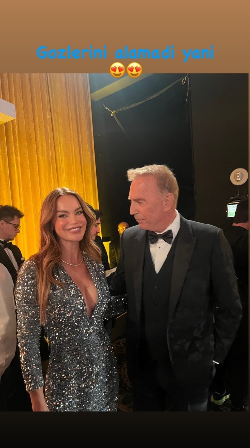 Ebru Şallı, Kevin Costner ile paylaştığı kareye ise "Gözlerini alamadı yani" yazdı.