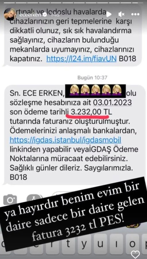 Gelen faturayı ekran görüntüsü alarak sosyal medya hesabından paylaşan Erken, "Ya hayırdır! Benim evim bir daire sadece bir daire, gelen fatura 3232 TL PES!" ifadelerini kullanarak duruma tepki verdi.