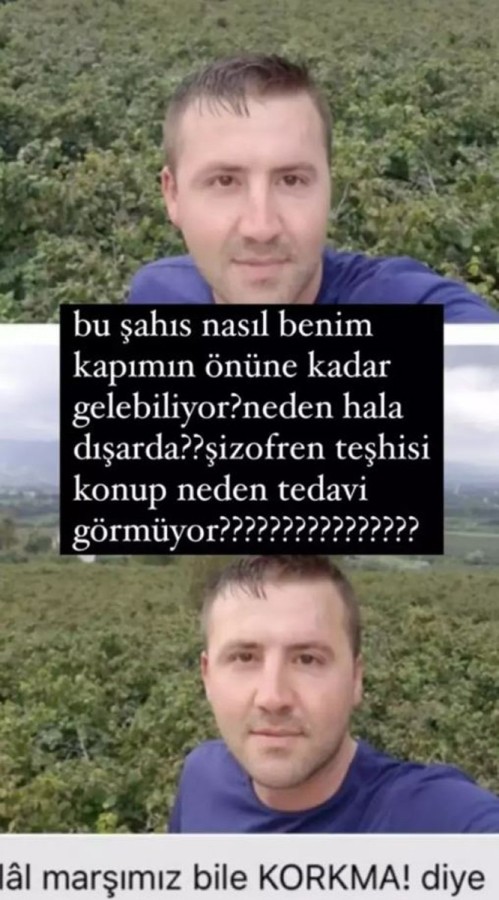 Ece Erken'in başı takıntılı hayranıyla dertte. Daha önce de kendisini tehdit ettiği için akıl hastanesine yatırılan Erdal Çınar'ın bir kez daha ortaya çıktığını açıklayan Ece Erken, Erdal Çınar'ın fotoğraflarını paylaşarak, "Bu şahıs nasıl benim kapımın önüne kadar gelebiliyor? Neden hâlâ dışarıda? Şizofreni teşhisi konup neden tedavi görmüyor?" yazdı.