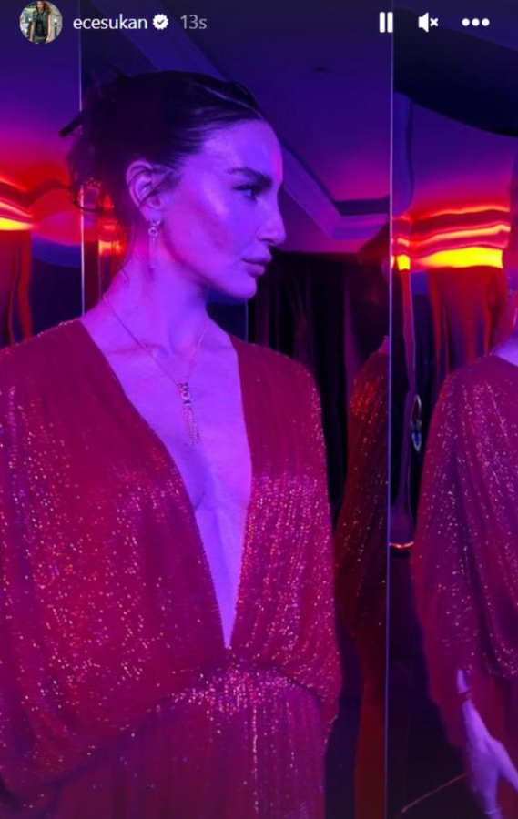 Kırmızı pul detaylı transparan bir elbise giyen Ece Sükan derin göğüs dekoltesi ve derin yırtmacıyla adeta büyüledi.