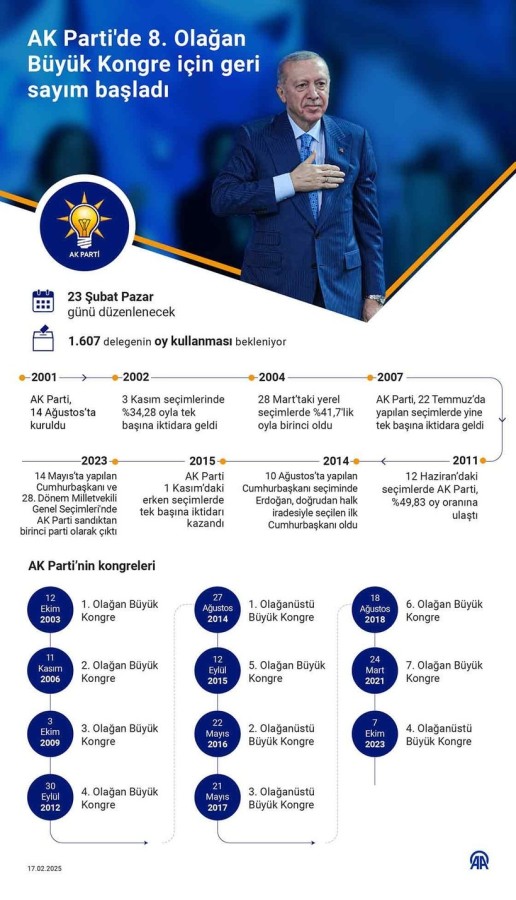 AK Parti'nin 23 Şubat Pazar günü yapacağı 8. Olağan Büyük Kongre sürecinde 12 Ekim'de ilçe, 30 Kasım'da ise il kongreleri başladı.