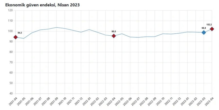 Ekonomik güven endeksi Mart ayında 98,8 iken, Nisan ayında yüzde 3,5 oranında artarak 102,2'e çıktı.