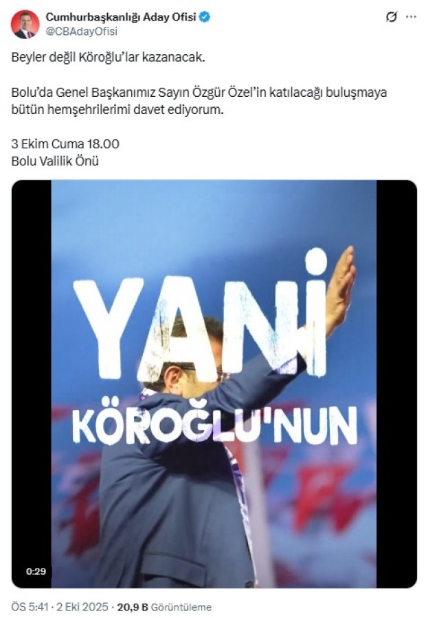 İBB Başkanı ve CHP'nin Cumhurbaşkanı adayı Ekrem İmamoğlu, partisinin Bolu'da yapacağı miting için yurttaşlara çağrıda bulundu.