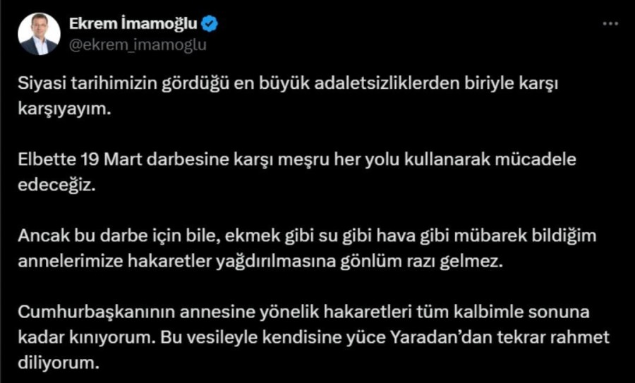 İmamoğlu yaptığı paylaşımda şu ifadelere yer verdi: