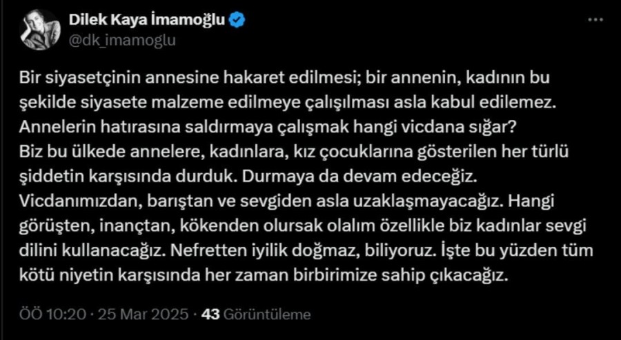 Dilek İmamoğlu ise, "Bir siyasetçinin annesine hakaret edilmesi; bir annenin, kadının bu şekilde siyasete malzeme edilmeye çalışılması asla kabul edilemez. Annelerin hatırasına saldırmaya çalışmak hangi vicdana sığar? Biz bu ülkede annelere, kadınlara, kız çocuklarına gösterilen her türlü şiddetin karşısında durduk. Durmaya da devam edeceğiz. Vicdanımızdan, barıştan ve sevgiden asla uzaklaşmayacağız. Hangi görüşten, inançtan, kökenden olursak olalım özellikle biz kadınlar sevgi dilini kullanacağız. Nefretten iyilik doğmaz, biliyoruz. İşte bu yüzden tüm kötü niyetin karşısında her zaman birbirimize sahip çıkacağız" ifadelerini kullandı.