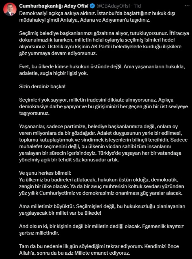 Yaşananlar, sadece partimize, belediye başkanlarımıza değil, onlara oy veren milyonlara da bir gözdağıdır. Adalet duygusunun yerle bir edilmesi, toplumu kutuplaştırmak ve sindirmek isteyenlerin bilinçli tercihidir. Sadece muhalefet seçmenini değil, bu ülkenin vicdan sahibi tüm insanlarını yaralayan bir sürecin içerisindeyiz. Türkiye'de yaşayan her bir vatandaşa yönelmiş açık bir tehdit söz konusudur artık.