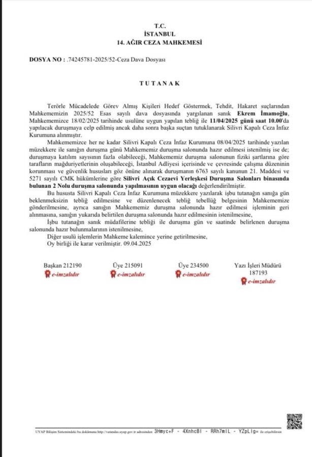 ''Ekrem Başkan'ın Akın Gürlek'e yönelik sözleri gerekçe gösterilerek 11 Nisan 2025'te Çağlayan Adliyesi'nde yapılacak duruşması, Silivri Açık Ceza Yerleşkesi 2 Nolu duruşma salonuna alındı.