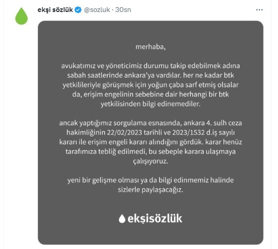 Ekşi Sözlük, Bilgi Teknolojileri ve İletişim Kurumu tarafından getirilen erişim engeline ilişkin sosyal medyadan yeni bir açıklama yayımladı. Sözlük açıklamasında, "Avukatımız ve yöneticimiz erişim engelinin sebebine dair herhangi bir BTK yetkilisinden bilgi edinemediler" ifadelerini kullandı.