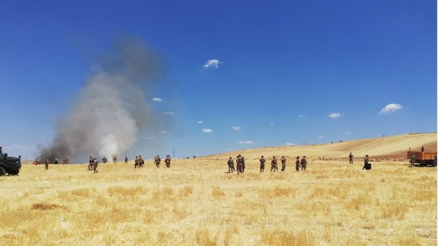 Güvenlik amacıyla burada bulunan jandarma ile birlikte tarlada çalışma yapan avukat ve sökme ekibi, bir anda kim tarafından çıkarıldığı henüz belirlenemeyen anız yangının ortasında kaldı.
