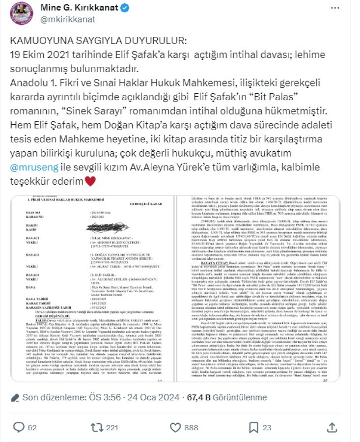 "19 Ekim 2021 tarihinde Elif Şafak'a karşı açtığım intihal davası; lehime sonuçlanmış bulunmaktadır. Anadolu 1. Fikri ve Sınai Haklar Hukuk Mahkemesi, ilişikteki gerekçeli kararda ayrıntılı biçimde açıklandığı gibi Elif Şafak'ın "Bit Palas" romanının, "Sinek Sarayı" romanımdan intihal olduğuna hükmetmiştir. Hem Elif Şafak, hem Doğan Kitap'a karşı açtığım dava sürecinde adaleti tesis eden Mahkeme heyetine, iki kitap arasında titiz bir karşılaştırma yapan bilirkişi kuruluna; çok değerli hukukçu, müthiş avukatım Murat Teber ile sevgili kızım Av.Aleyna Yürek'e tüm varlığımla, kalbimle teşekkür ederim."