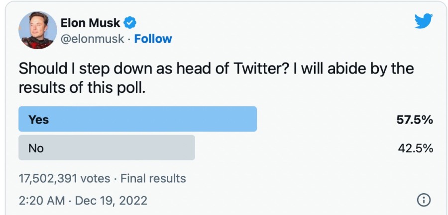 Elon Musk'ın Twitter kullanıcılarına yaptığı anket sonucunda katılımcıların yüzde 57.5'i platformun CEO'su olarak görevi bırakmasını istedi. Ankete yaklaşık 17.5 milyon kişinin katıldığı belirtildi.
