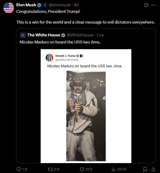 Musk, ABD'nin Venezuela hamlesini sadece bölgesel değil, küresel bir kazanım olarak değerlendirirken, "Tebrikler, Başkan Trump! Bu, dünya için bir zafer ve dünyanın her yerindeki kötü diktatörlere açık bir mesajdır." ifadelerini kullandı.