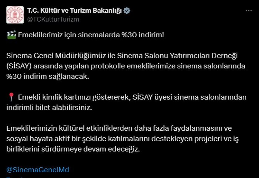Kültür ve Turizm Bakanlığı Sinema Genel Müdürlüğü ile Sinema Salonu Yatırımcıları Derneği (SİSAY) arasında imzalanan protokol ile emeklilere sinema salonlarında tüm seanslarda yüzde 30 indirimli bilet sağlanacak.