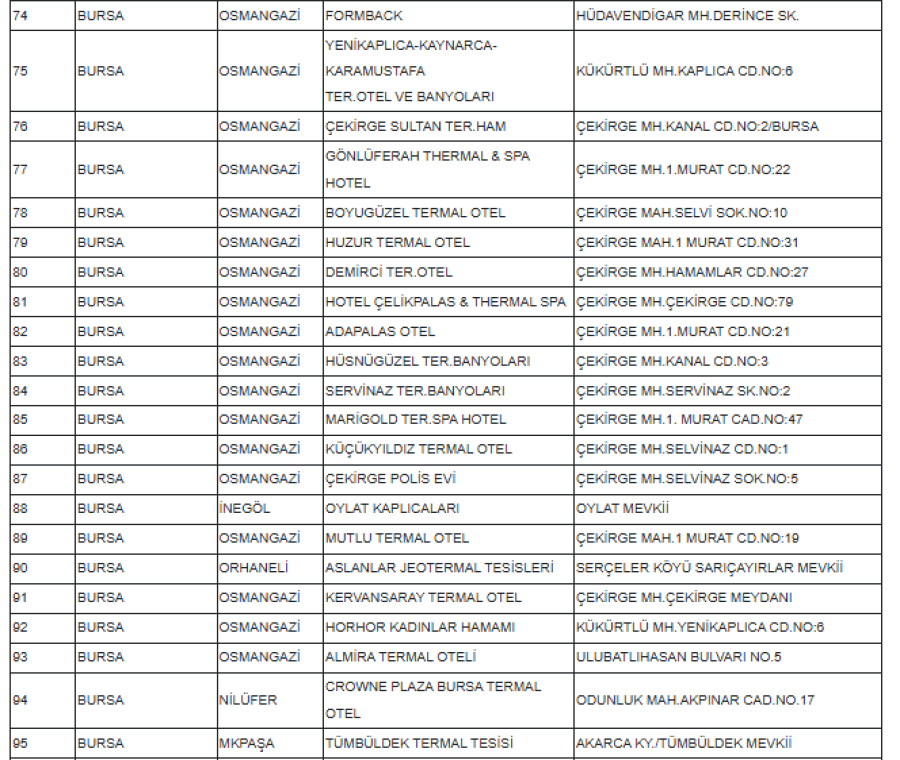 - Bursa Osmangazi: YENİKAPLICA-KAYNARCA-KARAMUSTAFA TER.OTEL VE BANYOLARI
