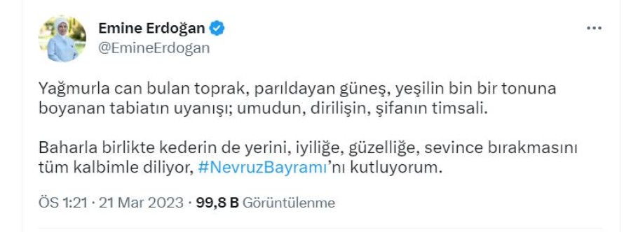 Emine Erdoğan, Twitter hesabından yaptığı açıklamada, "Yağmurla can bulan toprak, parıldayan güneş, yeşilin binbir tonuna boyanan tabiatın uyanışı; umudun, dirilişin, şifanın timsali. Baharla birlikte kederin de yerini, iyiliğe, güzelliğe, sevince bırakmasını tüm kalbimle diliyor, Nevruz Bayramı'nı kutluyorum" dedi.