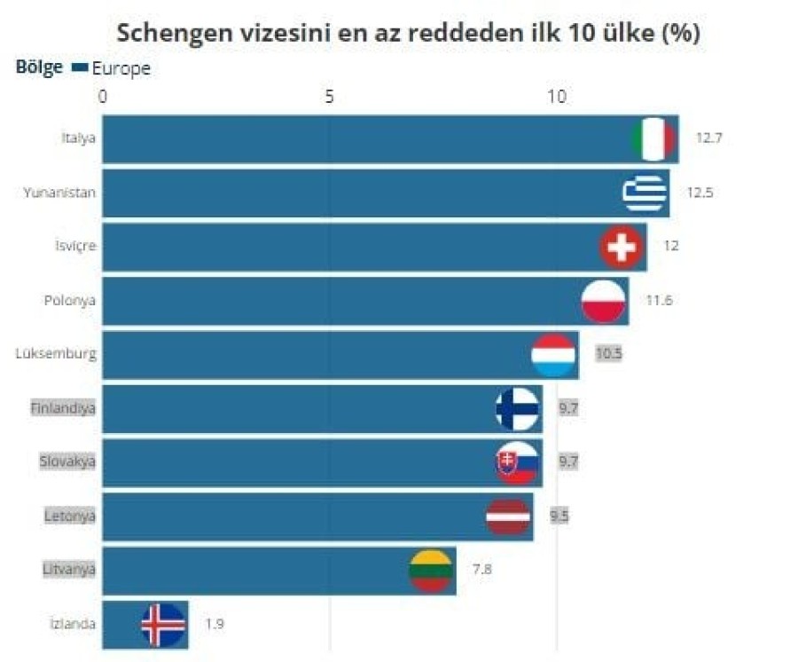 euronews'in SchengenVisaInfo.com'un Schengen vizelerine ilişkin 2022 verilerinden aktardığına göre, yüzde 1,9 ile İzlanda'nın bölgede en düşük ret oranına sahip ülke olduğunu gösteriyor.