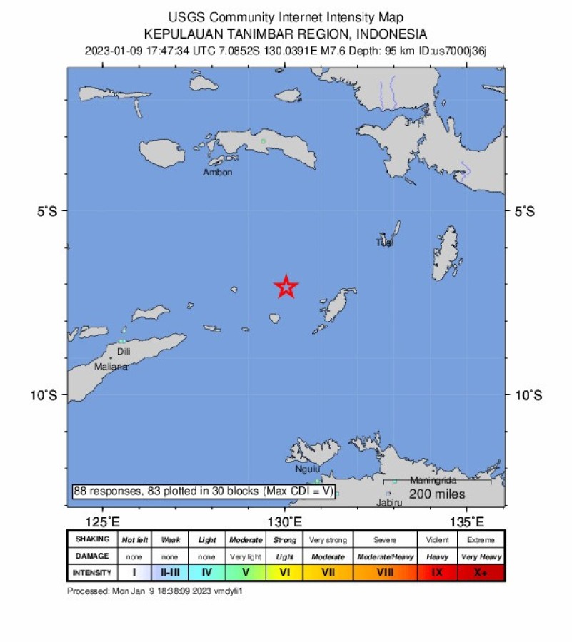 ABD Jeolojik Araştırma Merkezi (USGS) tarafından yapılan açıklamada, Endonezya'ya bağlı Tanimbar Adaları'nın bulunduğu bölgede 7.6 büyüklüğünde deprem meydana geldiği bildirildi. USGS, depremin 95 kilometre derinlikte yaşandığını açıkladı.