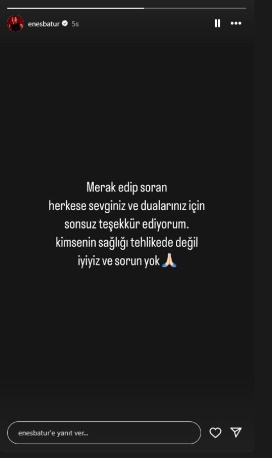 Kazanın ardından sosyal medyanın gündemine oturan ve sağlık durumu merak edilen Enes Batur Sungurtekin, 4,6 milyon takipçisinin bulunduğu Instagram hesabından açıklama yaparak "Merak edip soran herkese sevginiz ve dualarınız için sonsuz teşekkür ediyorum. Kimsenin sağlığı tehlikede değil. İyiyiz ve sorun yok" ifadelerini kullandı.