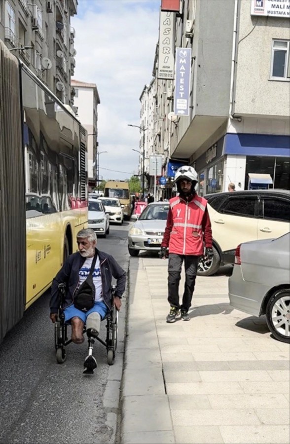Bir engelli, tekerlekli sandalyeyle kaldırımı kullanamayınca taşıt yolunda ilerlemek zorunda kaldı. Bir motokurye trafiği durdurarak engelli vatandaşa yardım etti. Bir süre yolda ilerleyen engelli kişiyi arkasındaki araçlar bekledi.