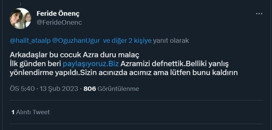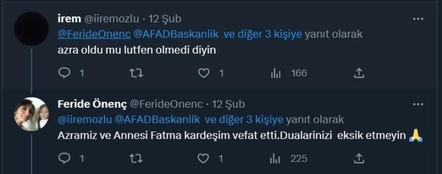 Azra ve ailesi enkaz altındayken sosyal medyadan yardım isteyen Feride Önenç isimli kadın, Azra'nın ölümünü doğruladı. Önenç şu paylaşımı yaptı: