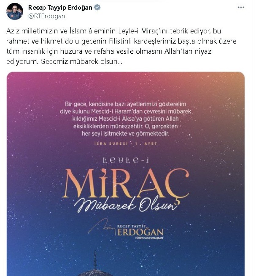 Cumhurbaşkanı Recep Tayyip Erdoğan, sosyal medya hesabı X'ten miraç kandili dolayısıyla mesaj paylaştı.