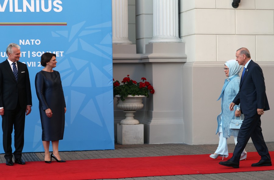Cumhurbaşkanı Recep Tayyip Erdoğan ve eşi Emine Erdoğan, Litvanya'nın başkenti Vilnius'ta gerçekleştirilen NATO Devlet ve Hükümet Başkanları Zirvesi kapsamında düzenlenen akşam yemeğine katıldı. Yemeğin gerçekleştirileceği Litvanya Büyük Dükleri Sarayı'na gelen Cumhurbaşkanı Erdoğan'ı Litvanya Cumhurbaşkanı Gitanas Nauseda ve eşi Diana Nausediene karşıladı.